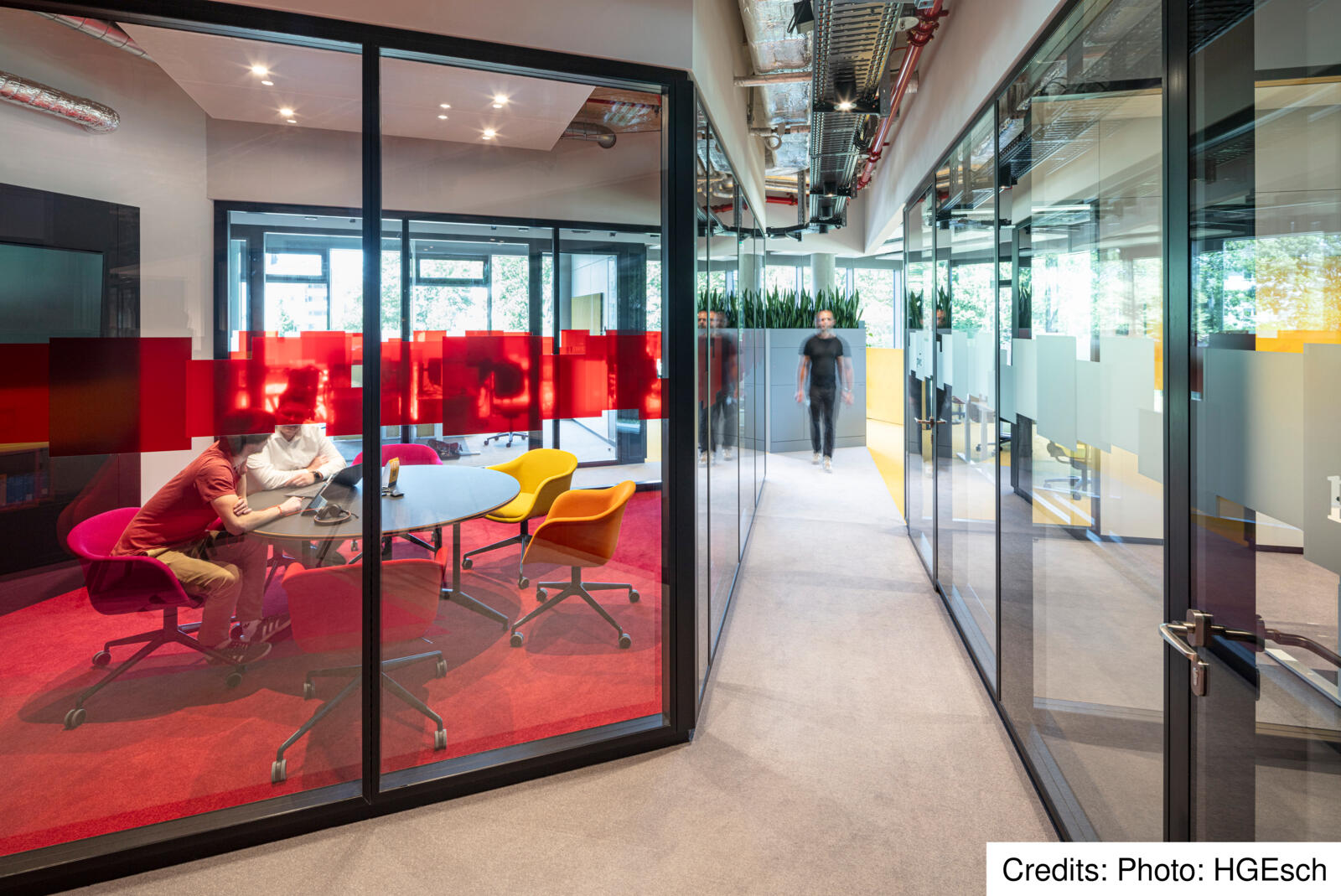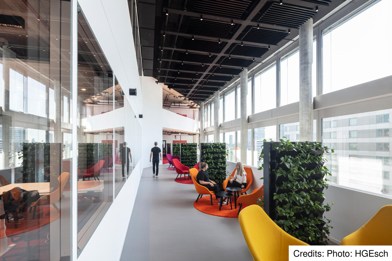 Aufgrund der Lage des Eclipse, umgeben von zwei sich kreuzenden Bundesstraßen mit hoher Lärmentwicklung im Außenbereich, befinden sich die Aufenthaltsflächen für die Nutzer von Eclipse im Wesentlichen im Inneren des Bürogebäudes. Herzstück sind die Atrien und Lichthöfe, die sich auf mehreren Etagen befinden und teils über drei Geschosse ragen. In diesen Atrien finden die Mitarbeiter verschiedenste Aufenthaltsbereiche, wie eine Cafeteria oder einen Veranstaltungssaal, die auch von außen betrachtet deutlich in der Fassade ablesbar sind. Dort, wo die planen Fensterflächen in der Glasfassade zu sehen sind, verbinden sich die Lichthöfe und formen einen „vertikalen Campus“, der bis zur Dachterrasse mit weitläufigem Blick über die Stadt reicht. „Das Eclipse agiert als ein Kommunikator und schafft eine städtische Verbindung zwischen Nachbarschaft und Arbeitswelt“ sagt Werner Sübai, Senior Partner HPP Architekten. Beim Bau des Gebäudes spielte auch das Thema Nachhaltigkeit eine große Rolle.