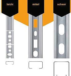 Greta trijų apkrovos variantų (lengvos, vidutinės ir sunkios) elektros sistemų montuotojai gali rinktis skirtingus medžiagos storius. Be to, siūlomas ypač įvairus angų išdėstymo pasirinkimas skirtingiems naudojimo atvejams. Dar vienas privalumas: bėgelių paviršius gali būti galvaniškai cinkuotas, karštai cinkuotas ir iš nerūdijančiojo plieno A2 ir A4, todėl paviršiaus tipą galima pasirinkti pagal naudojimo vietą.