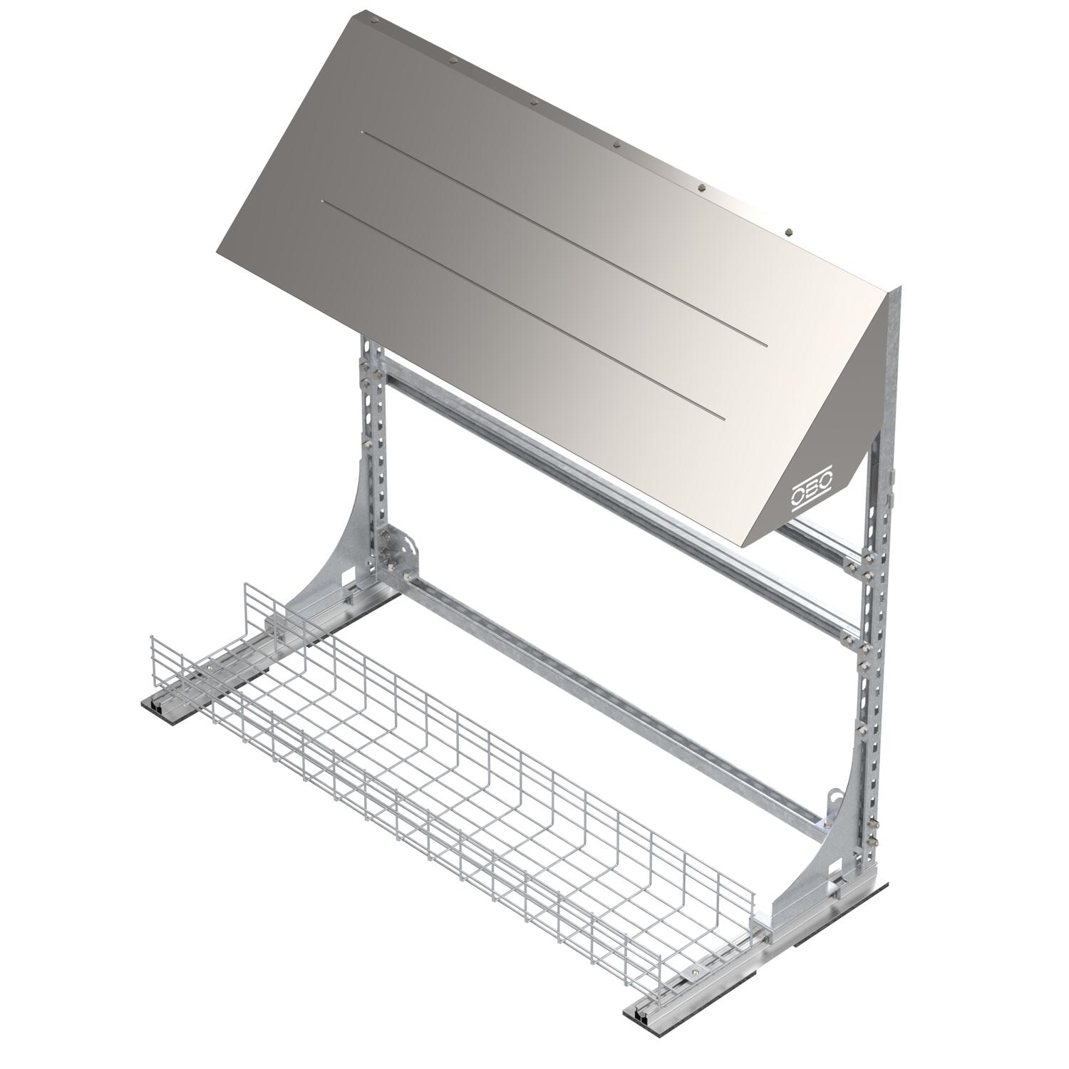 Prekės aprašymasInverter frame for the protected installation of several inverters for PV systems on flat roofs. Free-standing. Mesh cable tray included for ballasting and for the routing of cables.