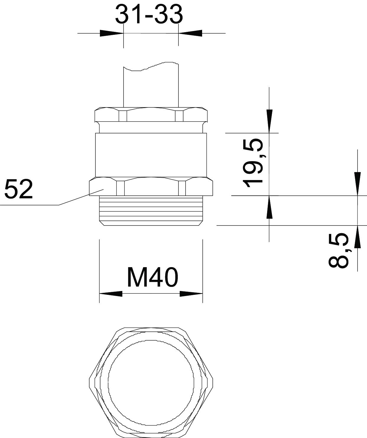Apsaugos nuo laidų ištraukimo galimybė ne Apsaugos rūšis IP54 apsaugota nuo sprogimo ne Atsparus smūgiams ne Be halogenų ne CO2₂ pėdsakas (GWP) nuo lopšio iki vartų 0,4 kg CO2e / 1 Vienetas Dydis M40 Keli sandarinimo įdėklai ne Lenkimo apsauga ne Maks. sandarinimo zona D 33 mm Matmuo E 54 mm Matmuo L1 8,5 mm Matmuo L2 19,5 mm Medžiaga Žalvaris Min. sandarinimo zona D 31 mm Paviršius Nikeliuotas Potencialiai sprogiai aplinkai be Rakto dydis 1 52 mm Rakto dydis 2 47 mm Sandariklis plokščiam kabeliui ne Sandarinimo tipas Sandarinimo žiedas Sriegio ilgis 8,5 mm Sriegio rūšis metrinis Sriegis M40 x 1,5 Su antveržle ne Sutvirtintas stiklo pluoštu ne - Visi tipai