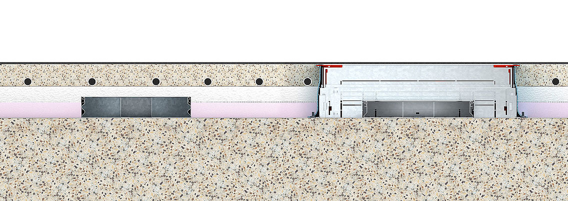 EÜK sistemos pogrindiniai kanalai ir montažinės grindų dėžės montuojami tiesiai ant betoninių grindų. Siekiant išvengti šilumos praradimo ir slopinti vaikščiojimo garsus, naudojami izoliaciniai sluoksniai. Šie izoliaciniai sluoksniai dengia visą kanalų sistemą. Ši sistema taip pat suderinama su grindinio šildymo sistema, įrengta grindų išlyginamajame sluoksnyje. Kanalų sistema įrengiama po grindinio šildymo sistema ir visiškai atskiriama izoliaciniame sluoksnyje.