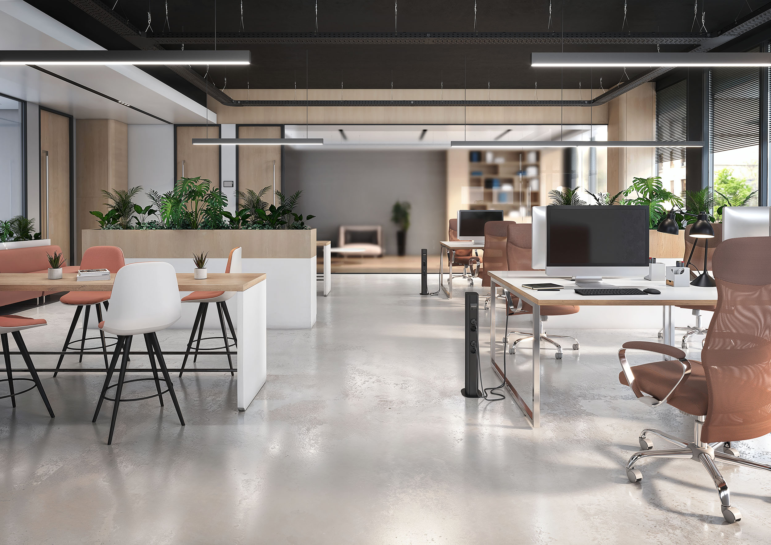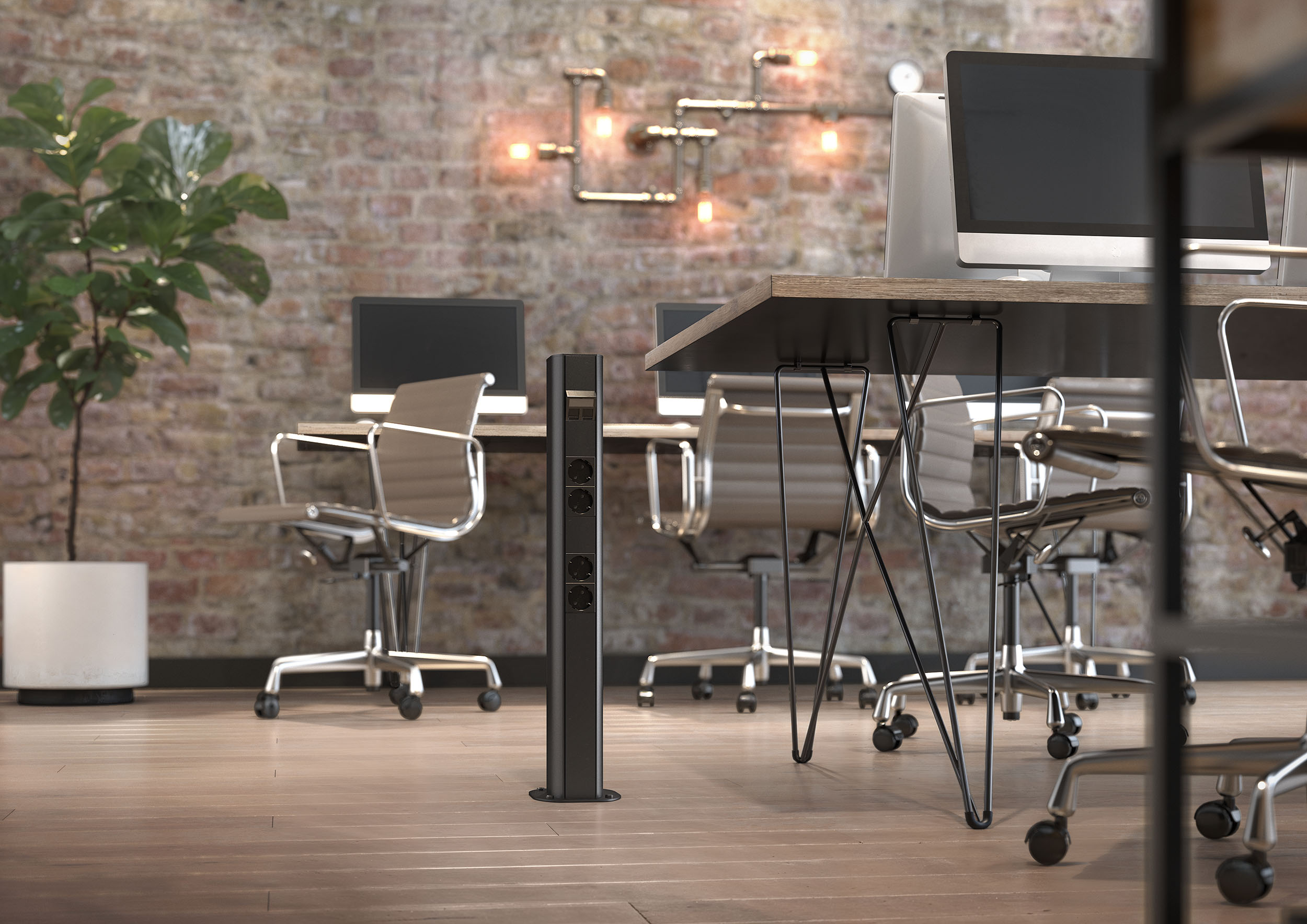 Šie aukščiausios kokybės sprendimai harmoningai užbaigia juodą stilių rafinuotame interjere. Be to, jie ne tik paskirsto kabelius per patalpą pagal dizainą, bet ir tiekia elektros energiją bei duomenis į reikiamą vietą. O jei jie yra patalpos viduryje, galima naudoti įvairias juodas instaliacines kolonas, kad būtų užtikrintas elegantiškas ir lankstus energijos tiekimą.