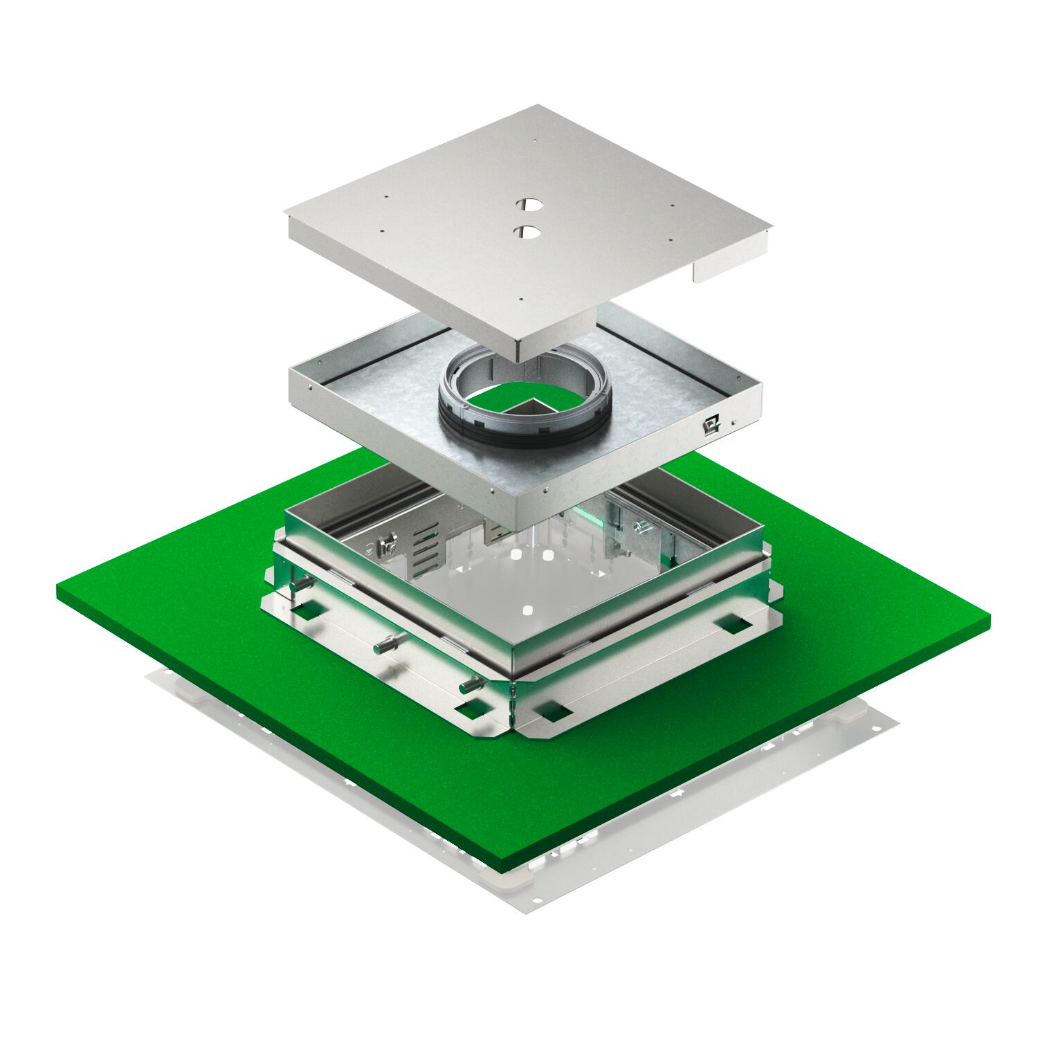 Height-adjustable cassette with tube body. For the installation of three UT4 universal supports for nine single devices with support ring/support clamp or 12 Modul 45® devices. The scope of delivery contains an aluminium screed protection cover (grindable), a suitable mounting lid to fix the cassette lined body and an ISO apron for decoupling from the underfloor connection socket.