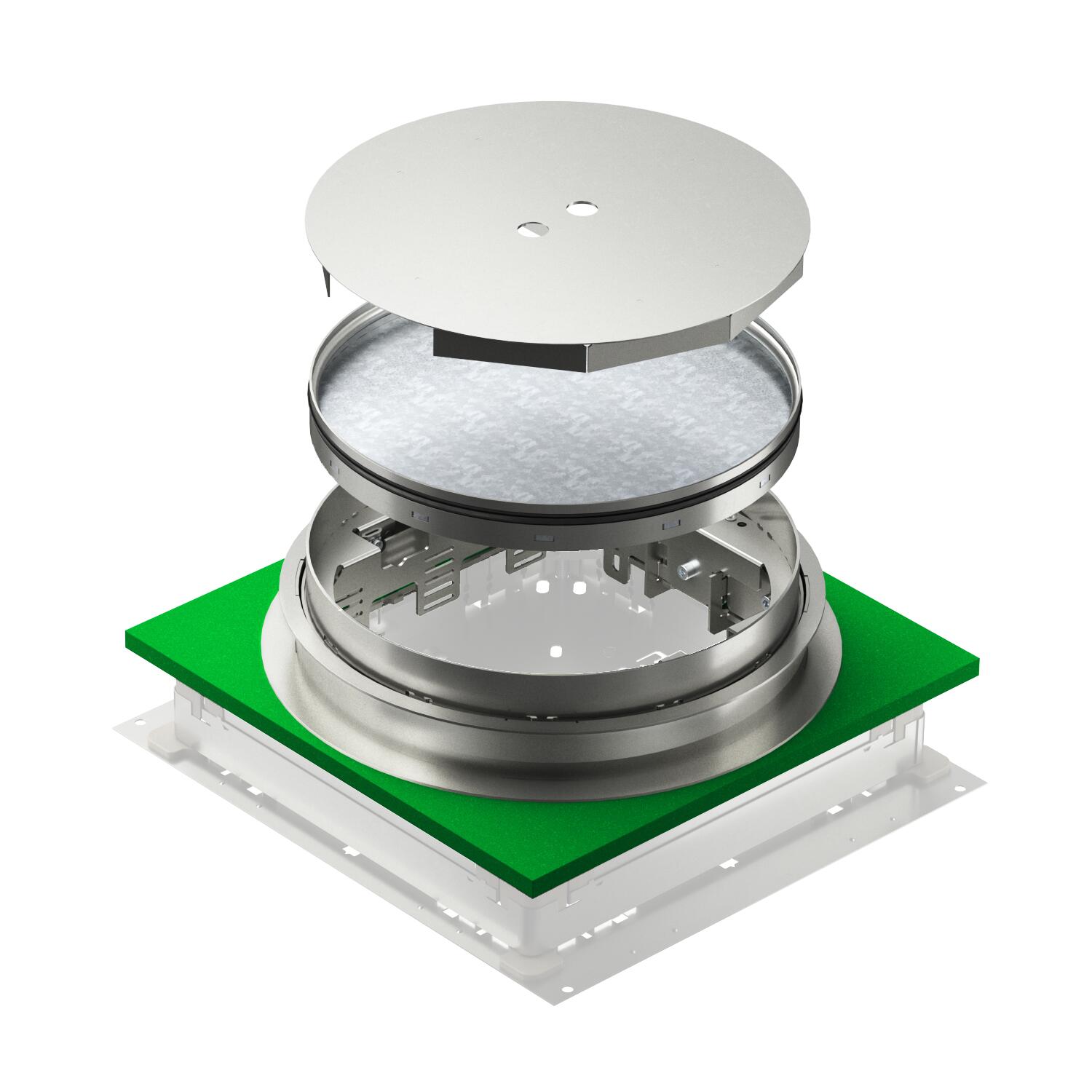 Nivellierbare Kassette mit Blindddeckel. Im Lieferumfang enthalten sind ein Estrichschutzdeckel aus Aluminium (überschleifbar), ein passender Montagedeckel zur Fixierung des Kassetten-Schalkörpers und eine ISO-Schürze zur Entkopplung von der Unterflur-Anschlussdose.