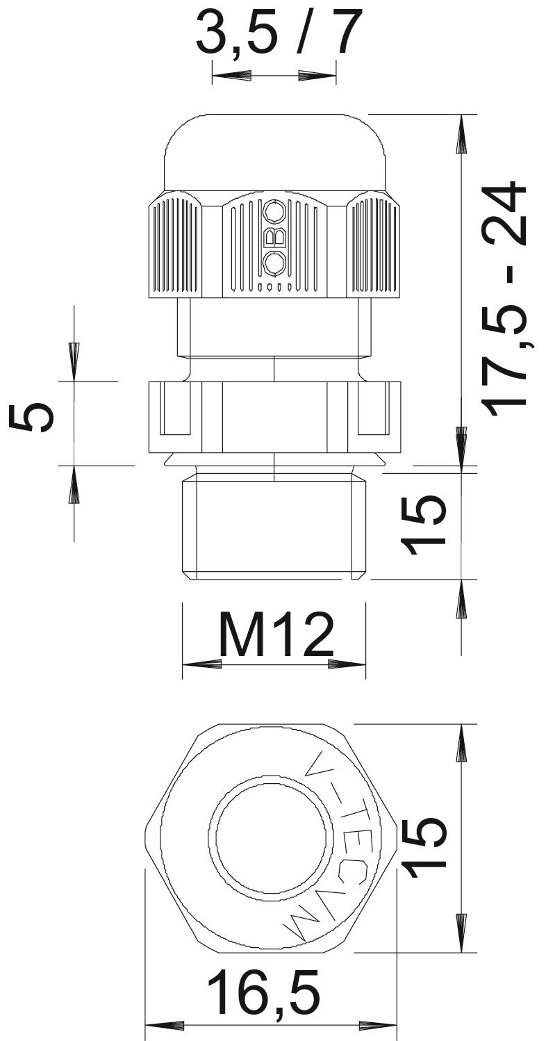 Apsaugos nuo laidų ištraukimo galimybė taip Apsaugos rūšis IP68 apsaugota nuo sprogimo ne Atsparus smūgiams ne Atsparus ugniai pagal VDE 0471/DIN 695, 2-1 dalį, bandomoji temperatūra – 650 °C Be halogenų taip CO2₂ pėdsakas (GWP) nuo lopšio iki vartų 0,0272 kg CO2e / 1 Vienetas Dydis M12 Išvadas tiesus Keli sandarinimo įdėklai ne Lenkimo apsauga ne Maks. naudojimo temperatūros diapazonas 65 °C Maks. sandarinimo zona D 7 mm Matmuo E 16,5 mm Matmuo L, maks. 24 mm Matmuo L, min. 17,5 mm Matmuo L1 15 mm Matmuo L2 5 mm Medžiaga Poliamidas Min. naudojimo temperatūros diapazonas -20 °C Min. sandarinimo zona D 3,5 mm Nestabilus sukimo momentas 2 Nm Nuimama varžtinė jungtis ne Potencialiai sprogiai aplinkai be potencialiai sprogiai aplinkai, dujos be potencialiai sprogiai aplinkai, dulkės be Rakto dydis 15 Sandariklis plokščiam kabeliui ne Sandarinimo tipas Sandarinimo žiedas Šešiakampio kampo matmuo 16,5 mm Spalva šviesiai pilka; RAL 7035 Sriegio ilgis 15 mm Sriegio rūšis metrinis Sriegio žingsnis 1,5 mm Sriegis M12 x 1,5 Su antveržle ne Sutvirtintas stiklo pluoštu ne Vardinis sriegio dydis 12 - Visi tipai