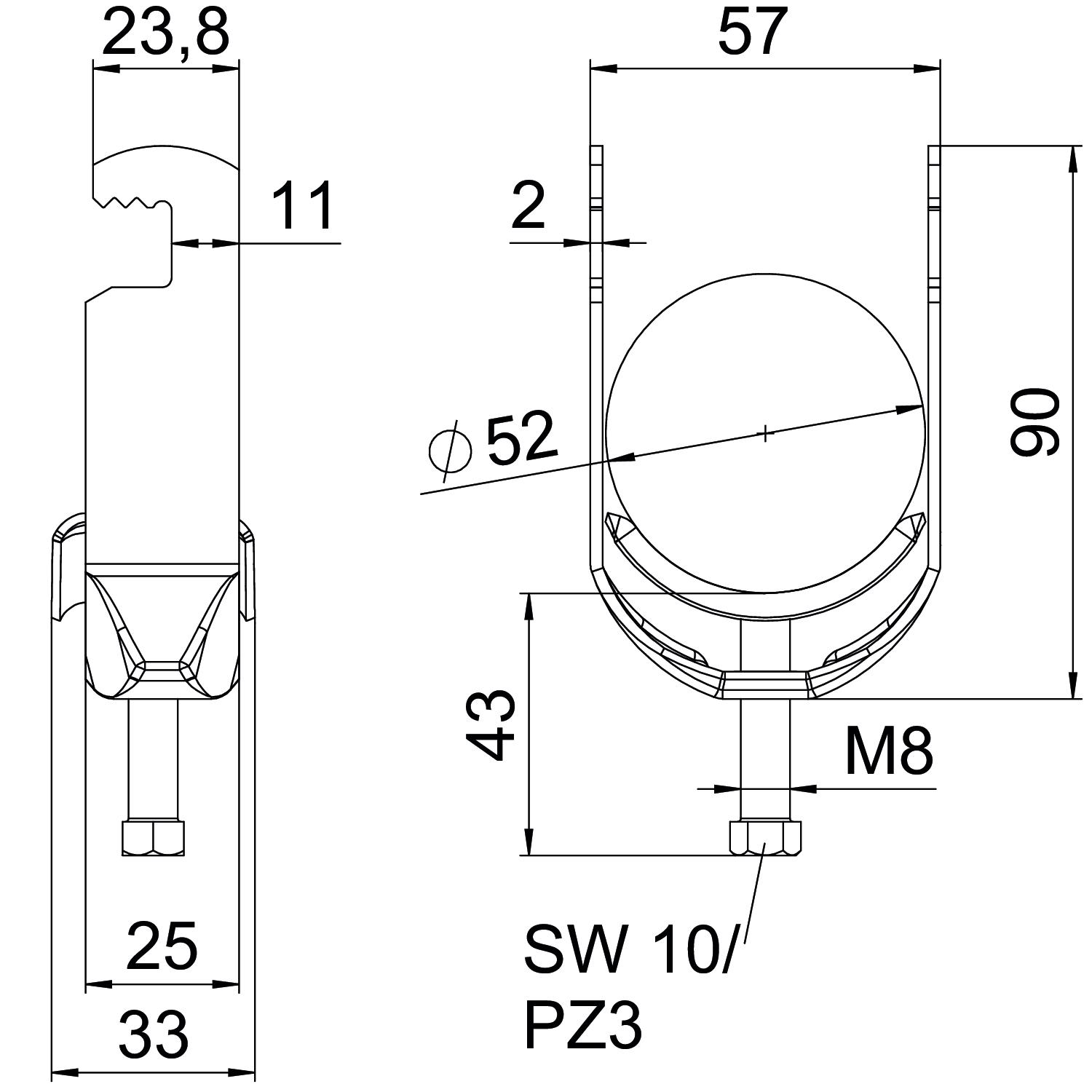 Aukštis 90 mm Be halogenų taip CO2₂ pėdsakas (GWP) nuo lopšio iki vartų 0,2676 kg CO2e / 1 Vienetas Dydis 46-52mm Ilgis 25 mm Išorės ilgio matmuo 33 mm Kabelių / vamzdžių skaičius 1 Maks. įtempimo zona D 52 mm Maks. Sukimo momentas 5 Nm Matmuo A 25 mm Matmuo B 57 mm Matmuo C 33 mm Matmuo G (mm) M8 Matmuo H 90 mm Matmuo L 43 mm Matmuo t 2 mm Medžiaga Plienas Min. įtempimo zona D 46 mm Montavimo būdas plokščias profilis Papildoma medžiaga Plienas Papildomas paviršius karštai cinkuotas Paviršius karštai cinkuotas Plotis 57 mm plyšiui 10 mm Skardos storis 2 mm skirta maks. vamzdžio skersmeniui 52 mm skirta min. vamzdžio skersmeniui 46 mm Sriegis M8 Su metaline vonele taip Su skaitikliu ne Tvirtinimo plokštelės medžiaga Plienas - Visi tipai